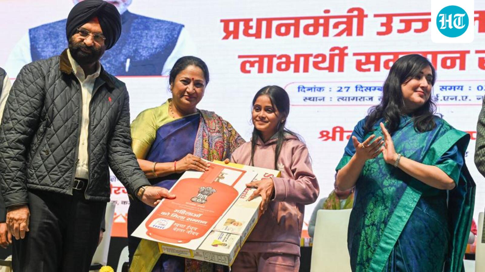 Chief minister Rekha Gupta gives a gas connection to a woman under the Pradhan Mantri Ujjwala Yojana at Thyagraj Stadium in New Delhi on Saturday. (RAJ K RAJ /HT PHOTO)