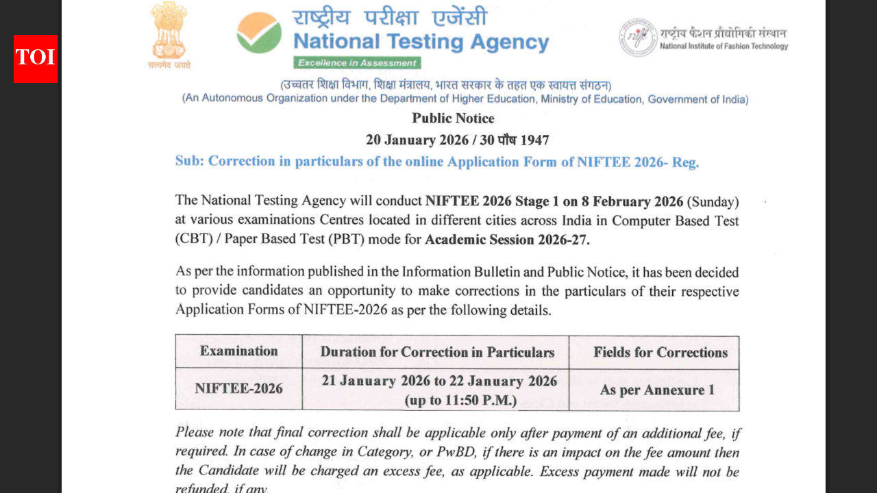 NIFTEE application form 2026: The National Testing Agency (NTA) will conduct NIFTEE 2026 Stage 1 on February 8, 2026 (Sunday) for admissions to the Academic Session 2026–27. The entrance examination will be held at multiple centres across India in both Computer-Based Test (CBT) and Paper-Based Test (PBT) modes.As per official information, the Stage 1 test will be organised in designated cities nationwide. Candidates will appear for the exam either in CBT or PBT mode, depending on the options selected during registration and the availability at examination centres.In line with details mentioned in the Information Bulletin and Public Notice, NTA has also announced a one-time opportunity for application form corrections. Candidates who have already submitted their NIFTEE-2026 application forms will be allowed to edit specific details.The correction window will remain open from January 21 to January 22, 2026, up to 11:50 pm. Previously, it was to open on January 20, 2026. Only the fields specified by NTA, as outlined in the official annexure, will be available for correction. No further chances will be provided once the window closes.